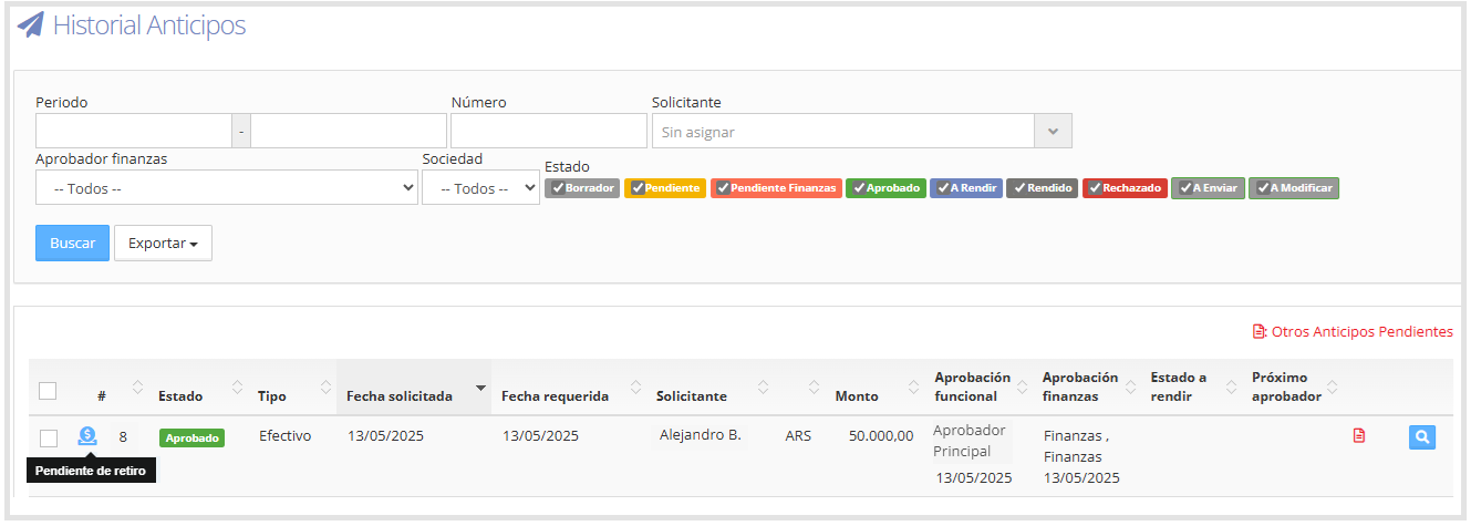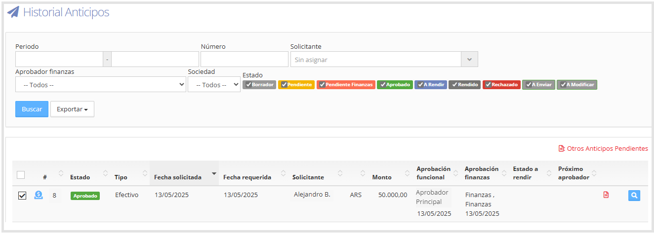 En esta sección se mostrarán los anticipos aprobados, como se ve en la siguiente imagen: