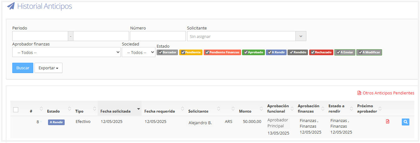 Una vez que se haya marcado como 'A Rendir' en el historial de anticipos, el estado del mismo se actualizará y mostrará 'A Rendir', como se muestra en la siguiente imagen: