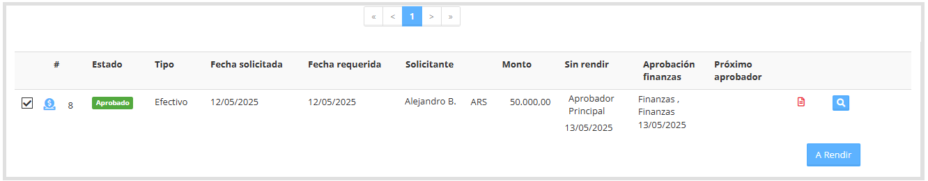 El ícono azul que se muestra al inicio de la fila permite realizar un control previo de los anticipos aprobados, antes de pasarlos al estado “A Rendir”.