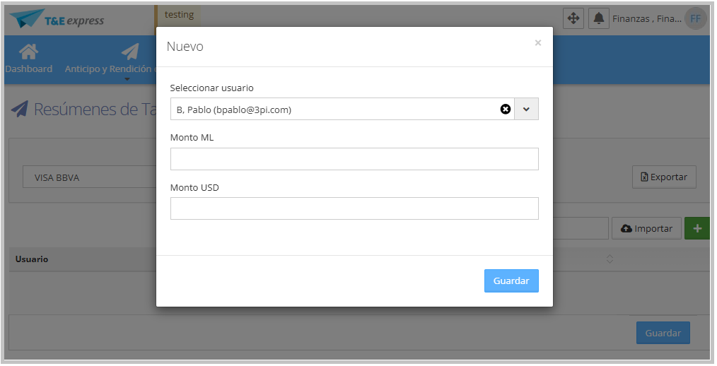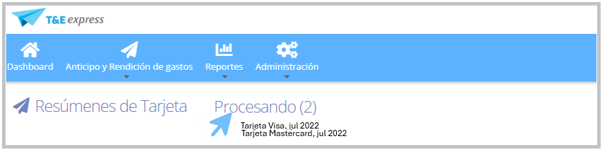Luego, en T&E Express, acceder a Anticipos y rendiciones de gastos > Rendiciones > Resúmenes de tarjeta