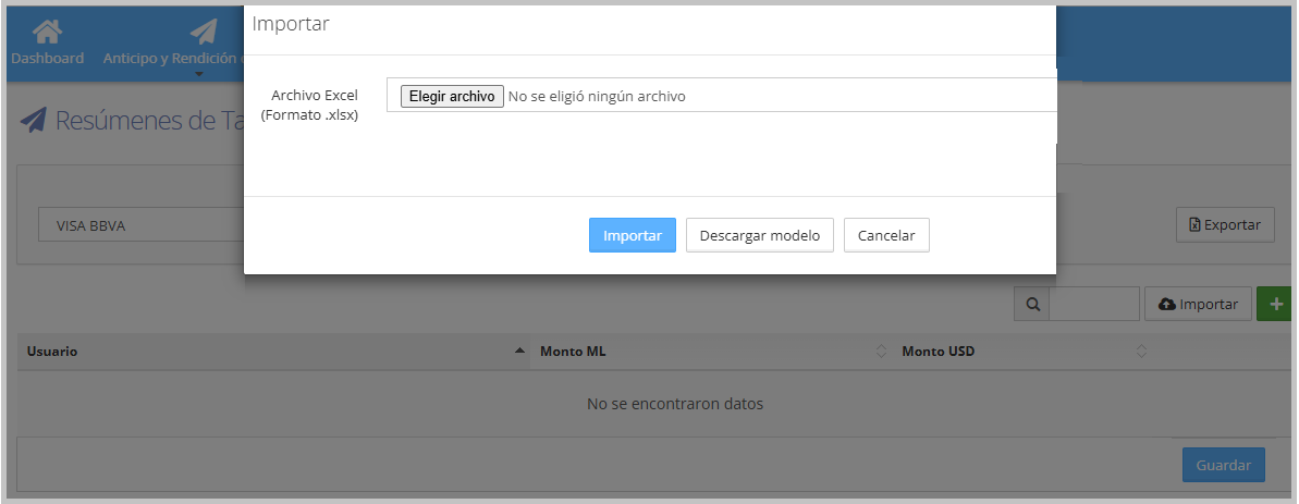 Tarjeta corporativa “sin template”: Cuando una tarjeta tiene el template “sin template”, los montos deben completarse manualmente para cada usuario o bien importarse desde Excel.