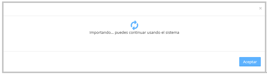 Al momento de guardar, el sistema mostrará una pantalla que informará que se está importando y que el usuario podrá continuar utilizando el sistema, haciendo clic en aceptar.