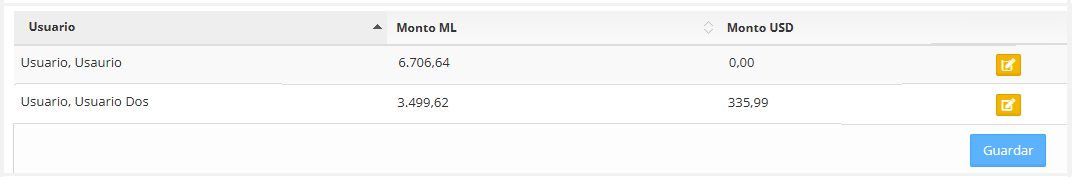 - A la derecha de cada fila estará disponible la opción Editar, que abre un cuadro donde podrás modificar el monto. Una vez realizada la modificación, deberás presionar Guardar para que se aplique el cambio.se mostrarán en la pantalla las filas con usuarios y sus respectivos montos.