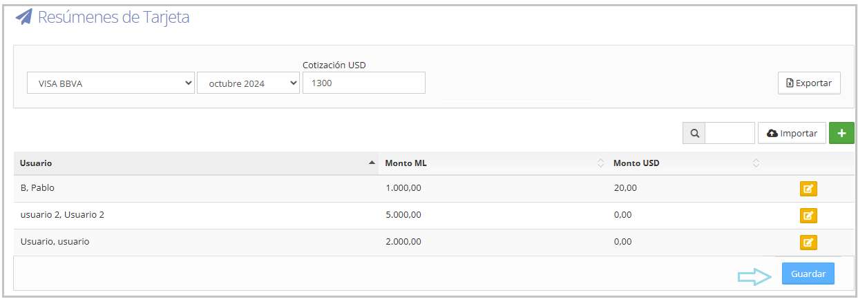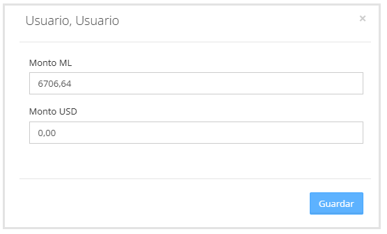 Se enlistarán todos los usuarios con sus respectivos montos, ya sea en la moneda en la que se efectuó el gasto.- A la derecha de cada fila estará disponible la opción Editar, que abre un cuadro donde podrás modificar el monto. Una vez realizada la modificación, deberás presionar Guardar para que se aplique el cambio.