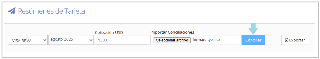Conciliación: La conciliación permite importar el resumen descargado del banco, cerrando el período y agregando al sistema los gastos que no fueron informados automáticamente mediante la integración.