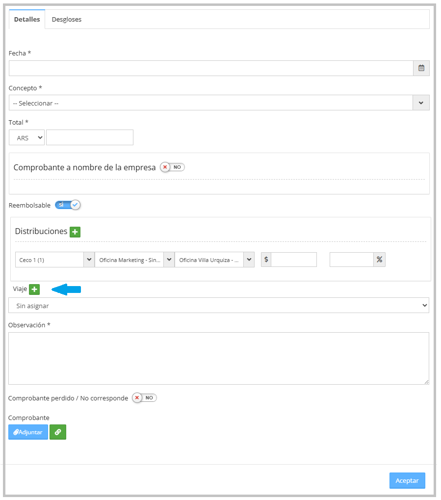 Viaje: Este campo se encuentra disponible en el formulario de gasto.
