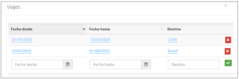- Desde esta pantalla se pueden eliminar los viajes cargados previamente haciendo clic en X .