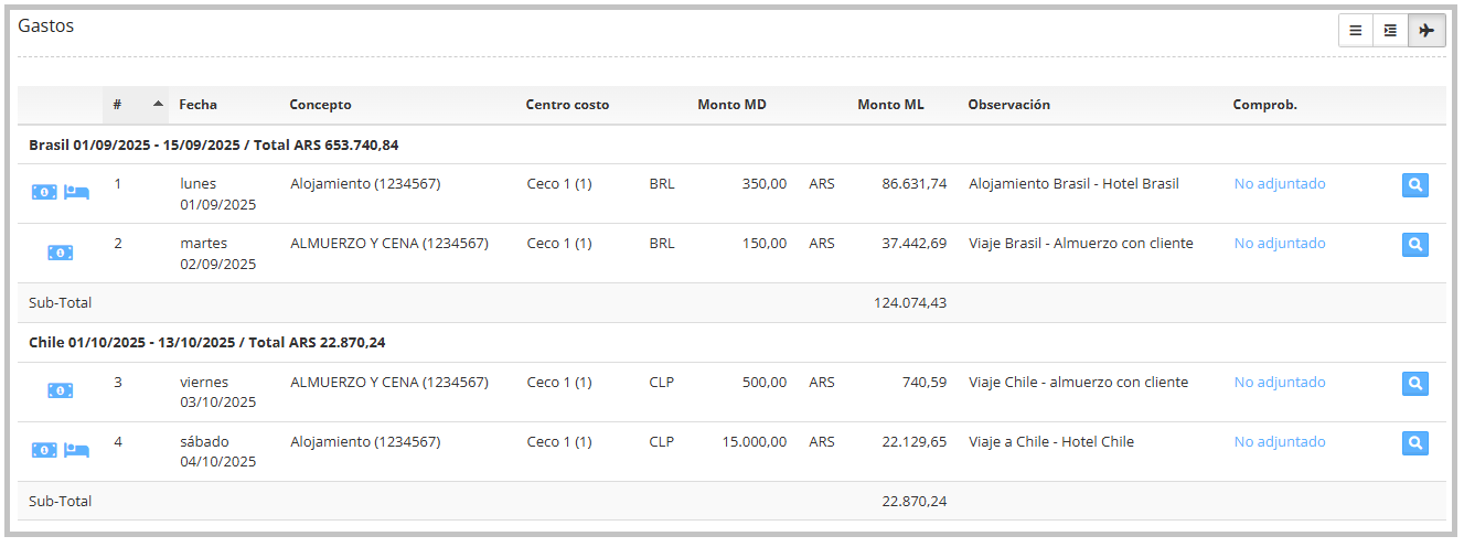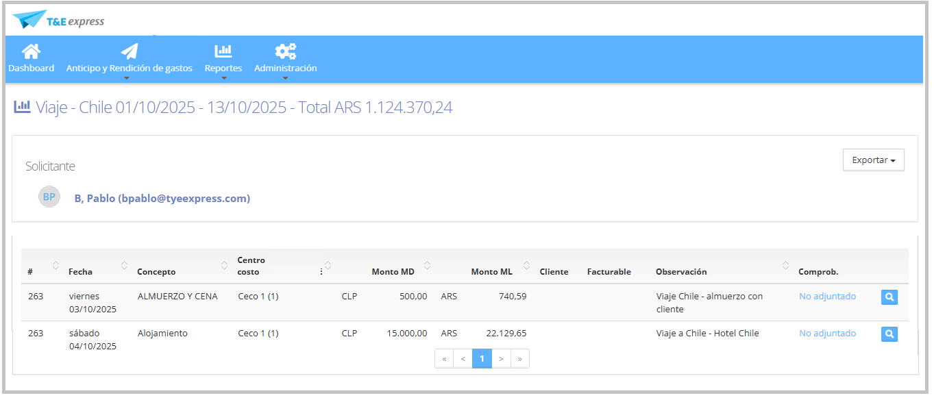 Al enviar la rendición, el sistema categorizará y agrupará los gastos según cada viaje registrado.
