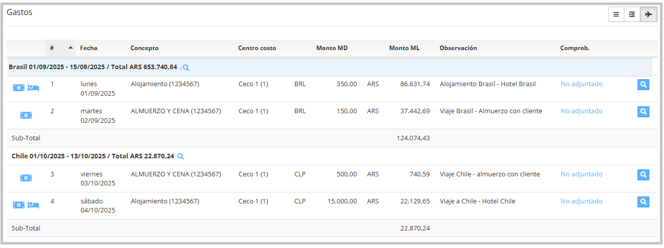 - Del lado izquierdo, al lado del destino y la fecha del viaje tendremos una lupa que, al presionar nos redirigirá a la siguiente pantalla donde veremos todos los gastos relacionados con el viaje seleccionado.