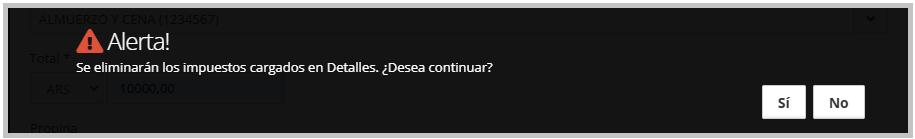 Si el usuario confirma, los impuestos previamente registrados en Detalle se asignarán al Desglose. Una vez en el Desglose, estos impuestos podrán editarse según corresponda, asegurando que queden correctamente registrados y evitando duplicados.