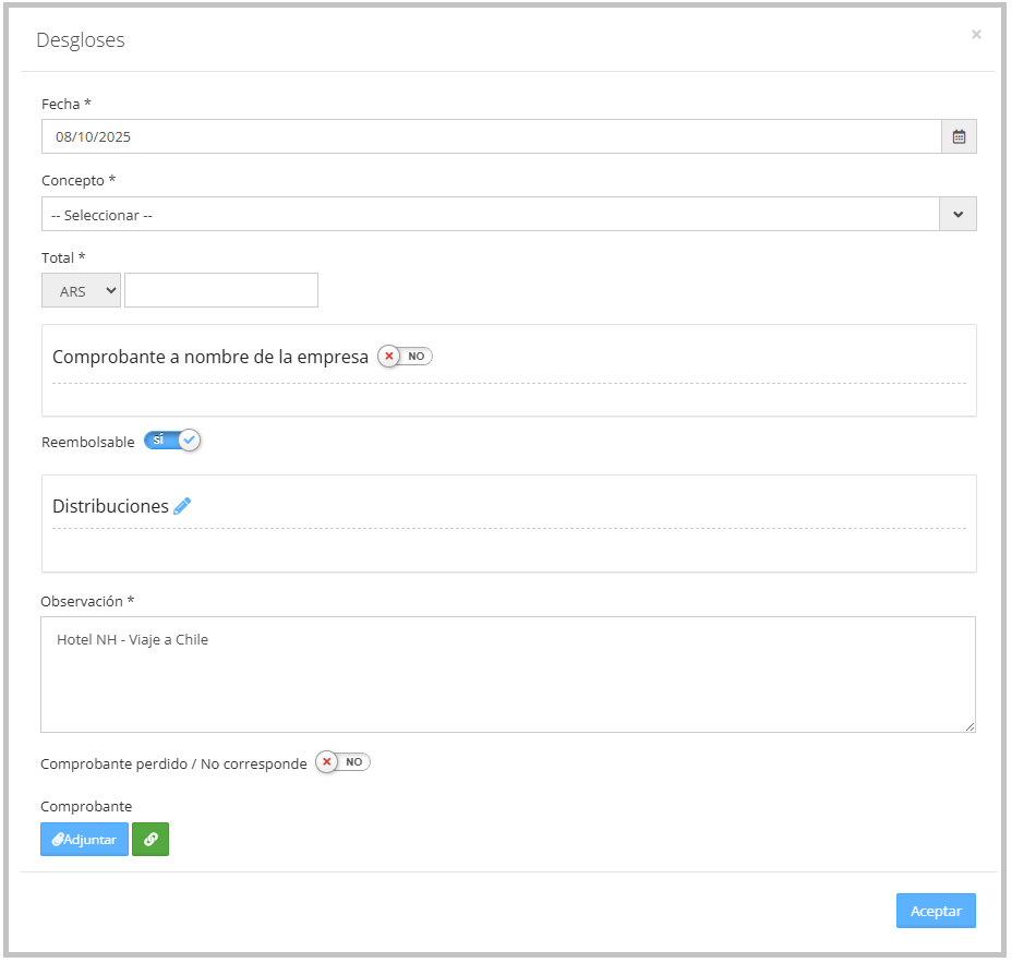 El Desglose te permite organizar y detallar ítems separados que correspondan al mismo gasto, lo que facilita tener mayor control y claridad sobre tus rendiciones, asegurando que cada gasto quede correctamente registrado.