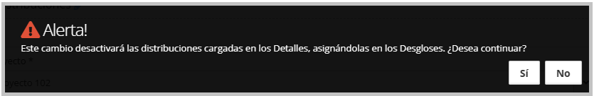 Este cambio desactivará las distribuciones cargadas en los Detalles, asignándolas en los Desgloses. ¿Desea continuar?