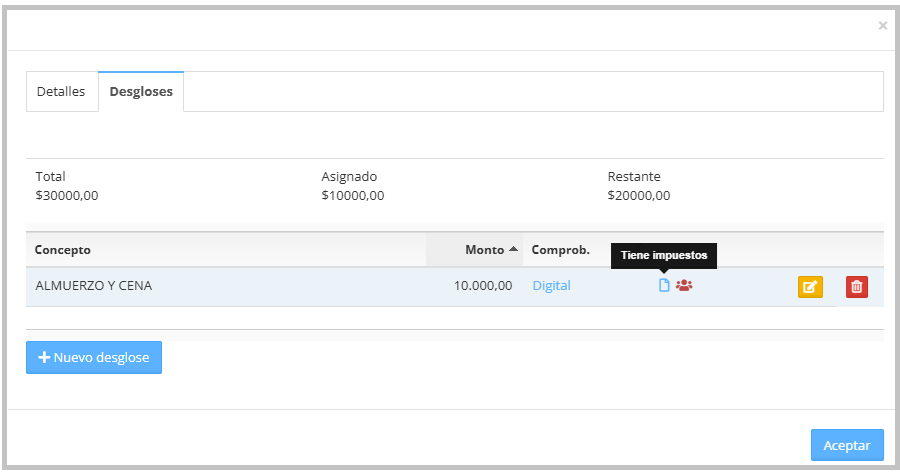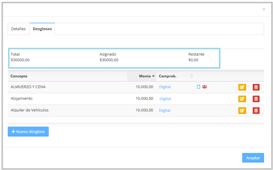 - Asignado: indica la suma de los importes ya cargados en los ítems de desglose.