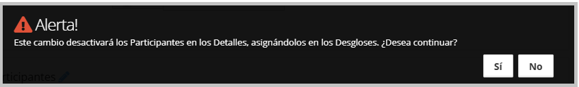 “Este cambio desactivará los Participantes en los Desgloses, asignándolos en los Detalles. ¿Desea continuar?