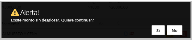 Al salir de la pantalla de Desglose presionando Aceptar sin haber finalizado todos los Desglose, el sistema mostrará la siguiente alerta:- “Existe monto sin desglosar. ¿Desea continuar?”
