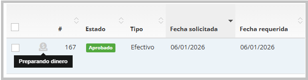 Anticipo aprobado: Una vez aprobado un anticipo por Finanzas, automáticamente aparece un ícono al inicio de la línea en el historial de anticipos. Por defecto, el ícono estará en color gris, indicando que se está "Preparando dinero".