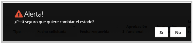 Cambio a “Pendiente de retiro”: Una vez que el dinero está listo para su retiro, cuando Finanzas/Tesorería presiona el ícono, aparece una alerta de confirmación indicando: “¿Está seguro que quiere cambiar el estado? SÍ / NO”