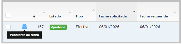 Al presionar Sí, el ícono cambia a color azul y, al pasar el mouse sobre el ícono, se mostrará el mensaje “Pendiente de retiro”, indicando que el anticipo ya está listo para que el usuario lo retire.