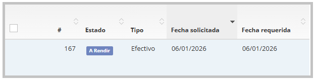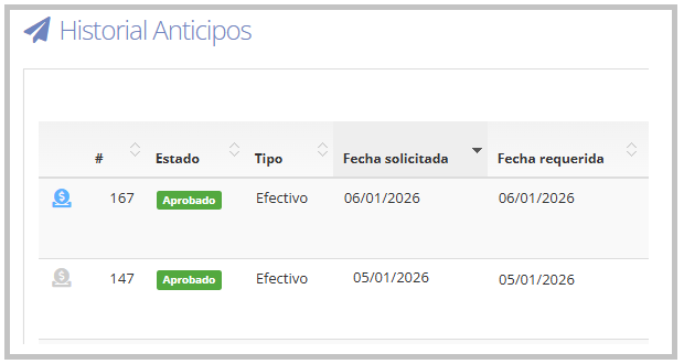 Estado "A rendir": Una vez que el anticipo se pasa al estado “A Rendir”, el ícono ya no estará visible en el historial de anticipos.