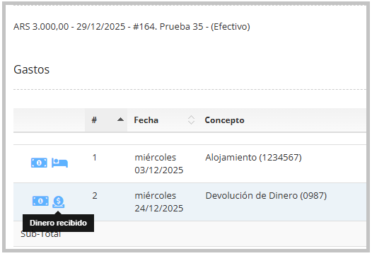 Rendición Aprobada: Cuando el tipo de gasto sea con “Devolución de dinero o Sobrante de anticipos” y esté en estado Aprobado por Finanzas/Tesorería, al ingresar al detalle de la rendición, en la línea del gasto con devolución verán un ícono que, por defecto, aparece en gris, lo que significa que el dinero aún no fue recibido.