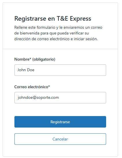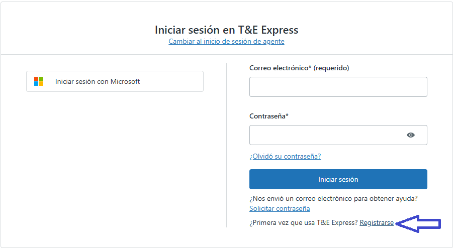 3. En caso de no contar con un usuario, podrás registrarte haciendo clic en “¿Primera vez que usa T&E Express? Registrarse”.