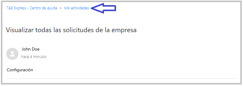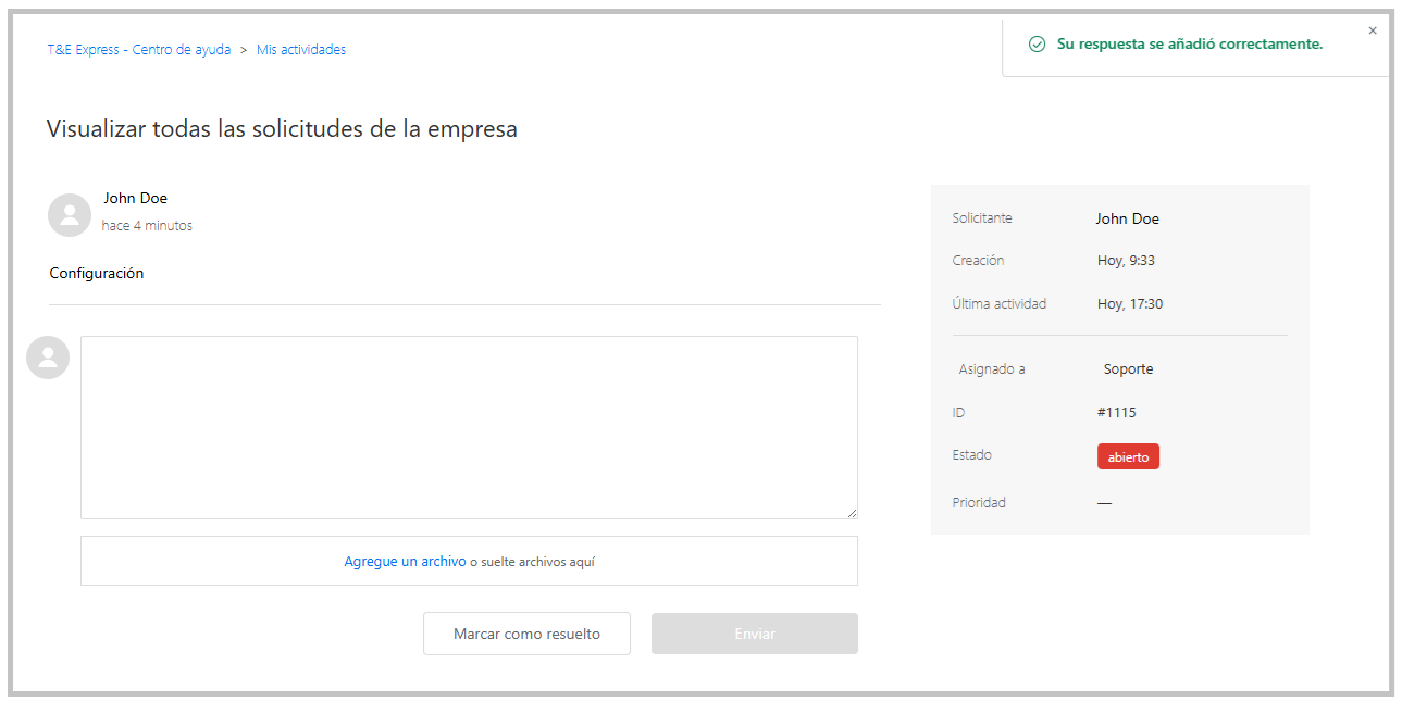 Desde el Centro de Ayuda, el usuario de Soporte Nivel 1 puede enviar solicitudes al equipo de T&E Express.