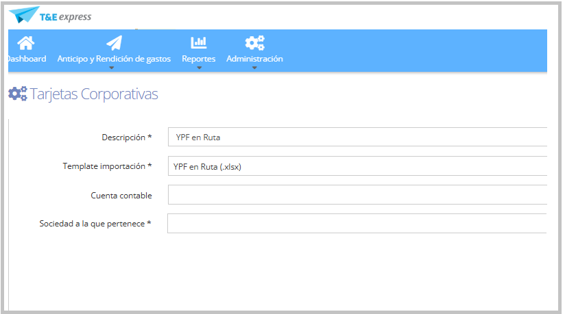 Para crear tarjetas de YPF en Ruta, se debe ingresar a Administración > Tarjetas Corporativas > Tarjeta.