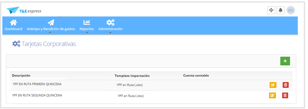 Una vez completada la información, hacer clic en Guardar. El sistema nos redirigirá a la pantalla de tarjetas corporativas, donde se visualizarán las tarjetas cargadas, como se muestra a continuación.